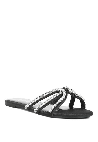 Dazzle 'em in these sparkling diamante-studded sandals that'll make you the life of the party! These sleek, chic flats are easy to slip on and oh-so comfy, with an insole that'll keep your feet cushioned all night long.